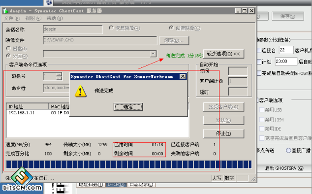 服务端这边显示传输信息,传输时间, 传送完成 1分18秒, 如图13,14