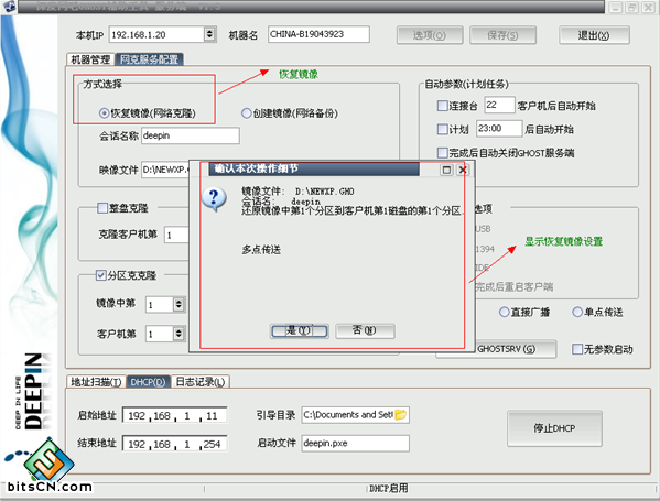 然后再恢复镜像,在网刻服务端设置 恢复镜像,由上传到服务器的GHO备份,还原到客户机.下面设置基本不便,注:设置多点传送, 然后启动ghostsrv 如图16