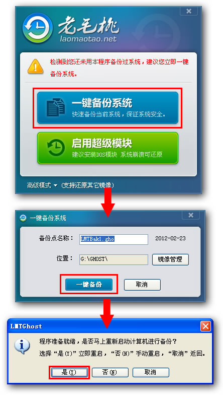 1、主程序兼容Win2003、Winxp、Win7以及WinPE系统。为避免部分杀毒软件误报,请尽量在运行程序前退出杀软或在安全类软件提示是否允许操作时信任本程序运行。第一次运行时程序会提示进行初始备份,点击一键备份系统按钮后根据程序提示选择重新启动。
