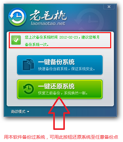 3、备份完毕后重新启动电脑,打开老毛桃一键还原程序即可看到程序自动检测到刚刚备份了系统。以后当系统中毒或是出现其它问题时点击一键还原系统( 请在还原之前提前备份好系统盘的个人资料,还原时将对C盘原有数据进行覆盖。 )即可将系统恢复到之前备份的状态。