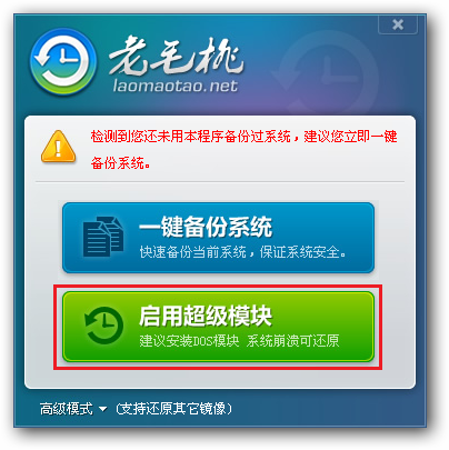 1、启用超级模块,能在系统崩溃时DOS状态下恢复系统,建议启用。超级模块允许用户自定义系统备份文件夹的属性,可以创建普通文件夹或者畸形文件夹(图形界面下无法删除),为了系统备份的安全还可以隐藏备份文件夹或者隐藏系统备份文件所在分区。可以设置密码保护,防止别人误操作,@热键启动的功能类似品牌机的一键恢复,可以自定义开机热键,电脑启动时按下即可立即进入老毛桃一键还原界面。