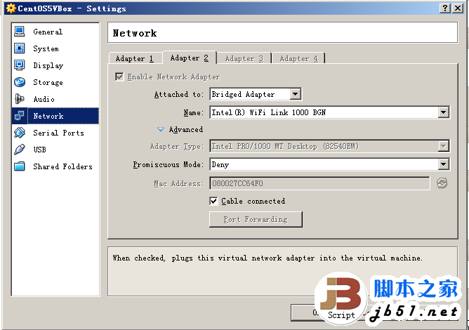 在Vitual Box软件中选择该虚拟机,打开网络设置。第一块网卡是Host-Only方式。点击Adapter2,配置如图所示: