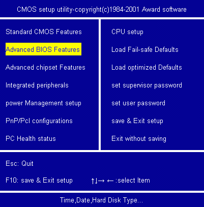 3、按“ESC”键返回CMOS主菜单,按"↓"到第二项"Advanced BIOS Features",回车.