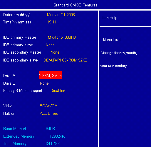 2、按“↓”键到“Drive A”项,按“PageDown”键选择"2.88M,3.5 in".