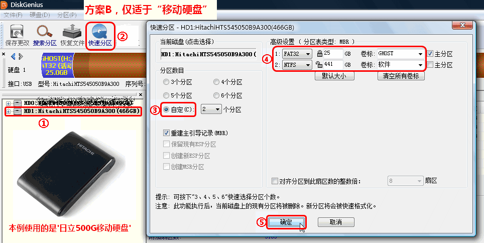 以后按提示操作即可,程序将自动执行分区、格式化、分配盘符等工作,完成后请关闭DiskGenius,拔掉移动硬盘。