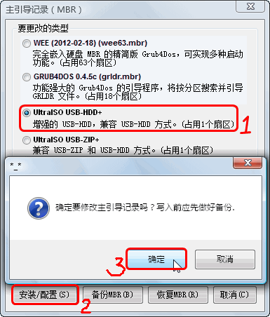 重新插入U盘->重新运行BOOTICE->【主引导记录】->UltraISO USB-HDD+->安装/配置->确定->确定->关闭(返回主界面)