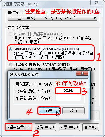 (4)【分区引导记录】->GRUB4DOS……->安装/配置->默认文件名GRLDR改成GYLDR->确定->