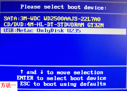 只要用方向键选择以“USB:”开头的那一项回车即可引导。(少数电脑必须选择以“HDD:”开头的选项后再选择U盘)
