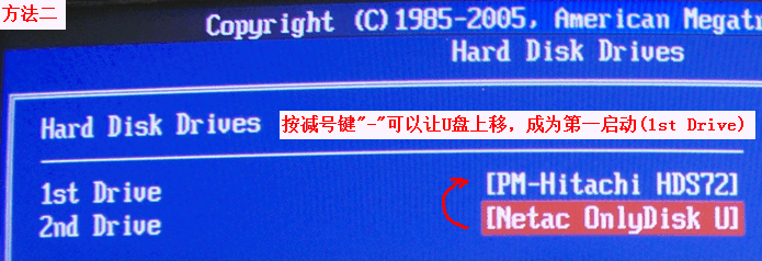 选择“Hard Disk Drives”回车,按减号“-”键或加号“+”键改变“1st Drive”和“2nd Drive”两项的位置,让U盘最终处于第一启动(1st Drive)的位置。