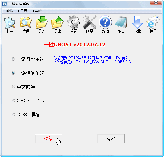 情况2、存在GHO,则自动定位到"恢复"选项上