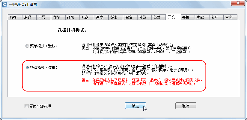 启动过程中将自动跳过3个额外菜单,直达一键备份或一键恢复警告对话框(10秒后自动执行)