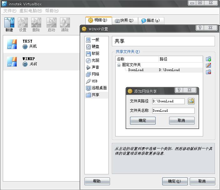 二,共享,就是在主机中创建一个文件夹,虚拟电脑跟主机共同使用,虚拟电脑里显示为网络硬盘