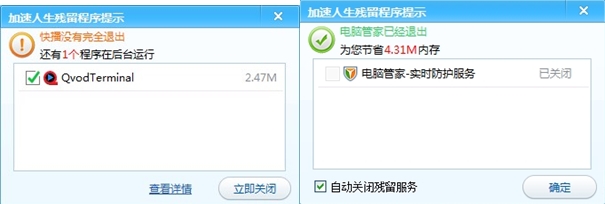 加速人生3.0.60.411版本 强化了此功能,程序残留服务提醒优化功能:只要用户退出一款软件后,如有残留的服务还在运行,将进行智能提醒,例如:快播没有完全退出,还有1个程序在后台运行。用户可以点击立即关闭,即可完全退出该软件的所有服务,真真正正的为电脑节省内存空间。