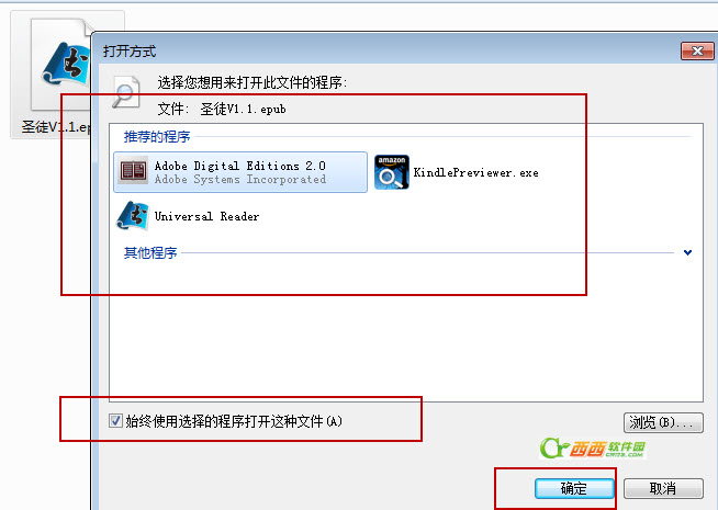 双击打开就可以为其设置默认的打开程序了,如果想以后一直 使用这软件打开epub的话记得勾选“始终使用选择的程序打开这种文件”