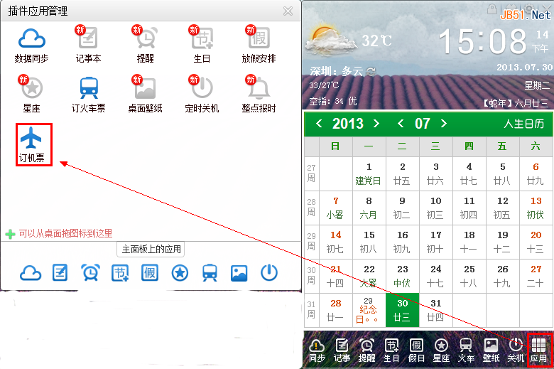 打开人生日历应用插件,我们就能看到插件里面新增了一个功能,订机票。