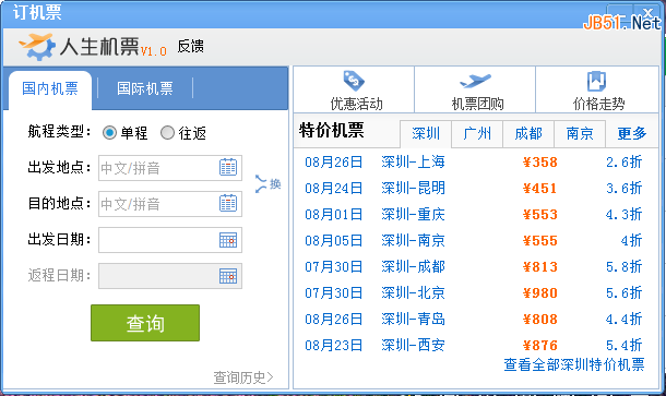 点击订机票,我们就能看到如下一个界面。在这个界面的左边,我们可以查询国内机票或者国际机票,单程或者往返。在人生机票的右边界面,我们还可以浏览到特价机票信息,以及机票的优惠活动,机票团购以及价格走势。具体操作,小编一一给你道来。