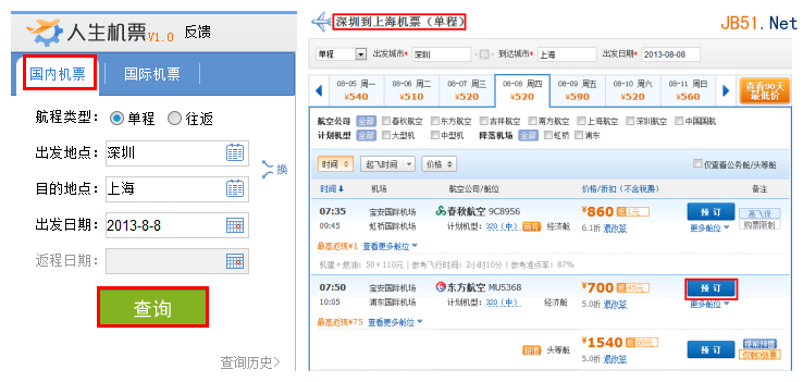 如果我们要订国内机票,只需选择或者输入出发和目的城市名称的拼音或英文,然后选择出发日期,点击查询就可以查询到具体的航班信息。例如,我要预订8月8号从深圳到上海的机票,那么只需输入具体的城市和日期,点击查询,我们就可以查询到航班信息了。在航班信息列表里面进行预订,就可以完成机票预订。国际机票和往返机票的预订方法和国内机票预订的操作是一样的。从人生日历跳转到具体的航班信息,能给我们节省很多预订机票的时间。