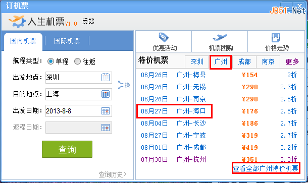 右侧特价机票信息也设计的很合理。无论你在哪一个城市,你都可以查询到你所在的城市到其他各个城市的特价信息。这样在你计划放假安排的时候,可以很清楚的了解到各个城市的机票价格,从而选择自己最中意的旅游地点。如果你在广州,那么你可以查询从广州到其他城市的特价机票,如果人生机票界面没有显示你想要去的城市的机票信息,那么还可以点击查看全部广州特价机票。系统会自动跳转到相应界面,方便你查看。