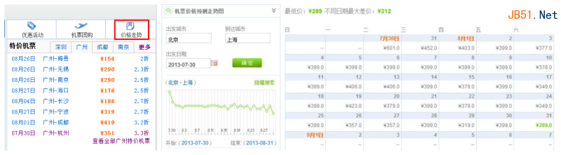 点击人生机票界面右上角的优惠活动,我们能够看到机票优惠活动信息;如果你喜欢团购机票,也可以点击机票团购,跳转的页面里面包含有国内外很多热点旅游城市的机票团购信息。我们还可以查询机票的价格走势,点击价格走势,我们可以看到跳转页面里面有价格日历,这样我们能很清楚的了解一个月当中,哪天的机票价格是最便宜的,以此来安排自己的出行计划。