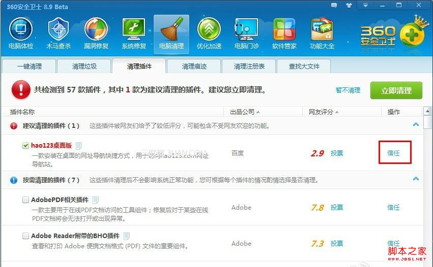 打开360安全卫士→ 电脑清理→清理插件→找到hao123桌面版→ 点击信任