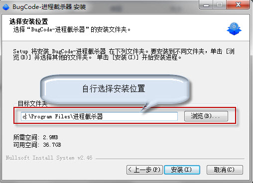 下载进程截杀器解压后,运行BugCode_taskkill.exe即可进入安装,安装过程中要注意的是安装位置的选择,建议不要选择c盘!