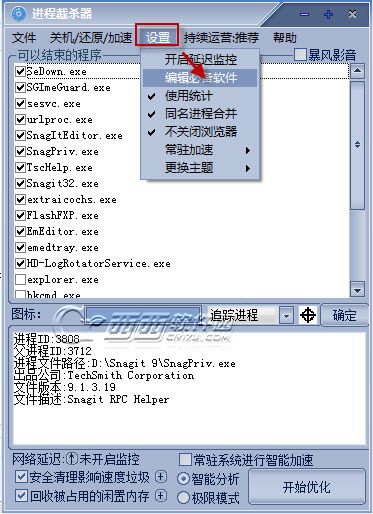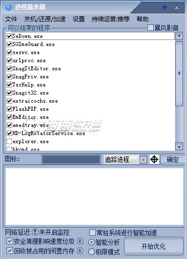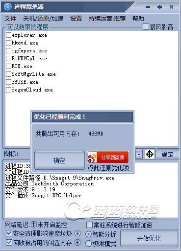 注意:优化时,选中的软件进程会被关闭!