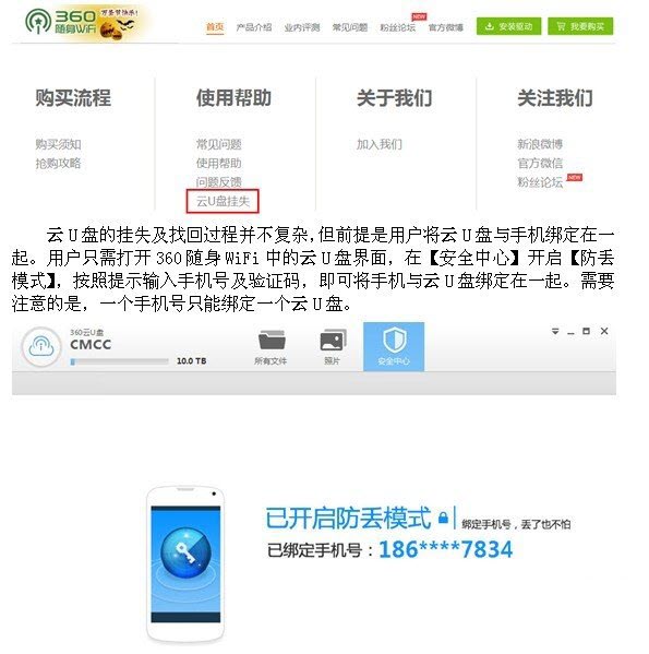 手机与云U盘绑定后,如果360随身WiFi丢失,则可以到360随身WiFi官网进行挂失及找回,用户在挂失过程中需要输入绑定的手机号,验证成功后登录并确认挂失,此时原来云U盘中的数据就会被抹掉,即使被其他人捡到也不用担心自己的数据信息外泄了。