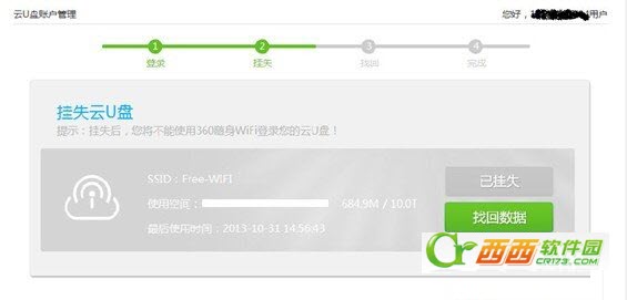 云U盘挂失之后,如果想要找回原来云U盘中的内容,可从360随身WiFi官网进入点击【找回数据】,跳转至新注册360账户页面,注册成功后,原云U盘中的内容即被转移到新的360云盘,从而找回云U盘中存储的数据。