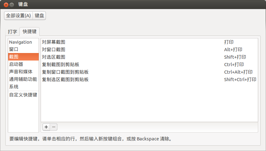进入系统设置 -- 键盘 -- 快捷键 -- 截图 -- 自定义或修改