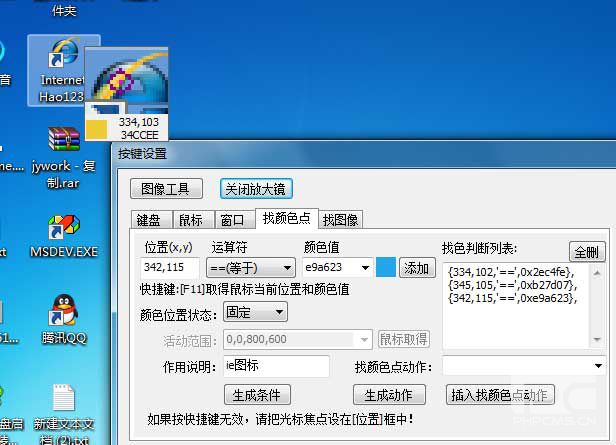 1.在[按键设置]中选[找颜色点]选项页,打开[放大器],把鼠标移动到桌面的IE图标上,然后按快捷键[F11],把IE图标的颜色点和坐标位置加入颜色点列表中。这里取3-4个有代表的颜色点就可以了。接着关闭放大镜,把在[作用说明:]输入:ie图标,点击[生成条件],完成找色条件。