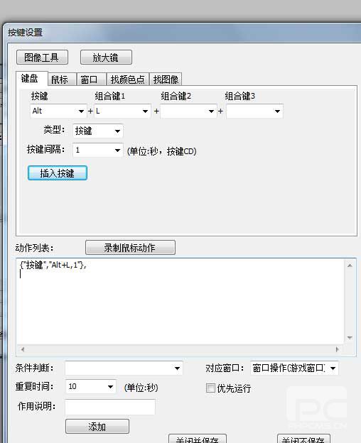 2.然后切换到“键盘”选项页,在“按键”框中选Alt,在“组合键1”中选L,然后点”插入按键”,然后把“重复时间:”输入:10,表示每10秒运行一次。在“对应窗口:”选“窗口操作(游戏窗口)”,最后点“添加”。这样就实现第10按下Alt+L键,让游戏人物自动走动。