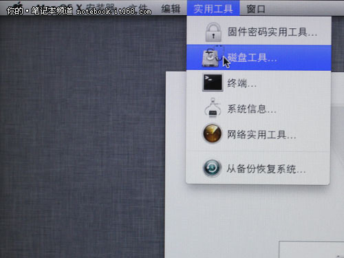 ▲继续安装,再次卡在磁盘格式部分,从安装界面上方调出“磁盘工具”来解决
