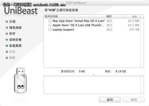 因为前面是用Mac App Store下载的安装程序,可以勾选第一项“Mac App Store“Install Mac OS X Lion””前面的方块来制作台式电脑安装盘;第二项可以在使用原装USB启动盘时勾选;勾选第三项后可以启动笔记本。