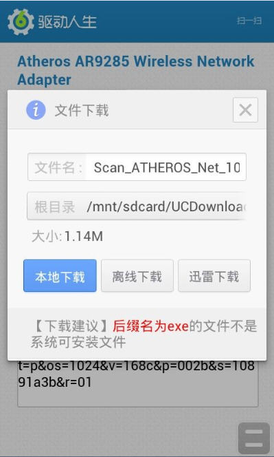 扫描完成,识别成功之后,会出现一个驱动人生网卡驱动的下载页面,这个就是网卡驱动了。温馨提示:建议在WIFI环境下下载该网卡驱动,否则运营商可能会收取相关费用。点击下载,选择根目录,再点击本地下载,就可以将网卡驱动安装包下载到手机上了。