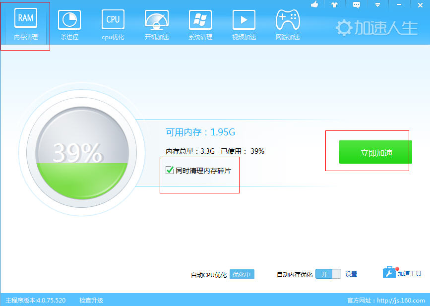 3、加速的同时还可以清理内存碎片;