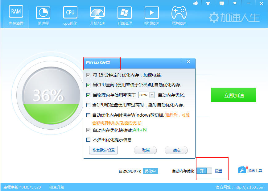 内存都去哪儿了?加速人生替您一键清理内存。打开加速人生的“内存清理”界面,立即加速清理。