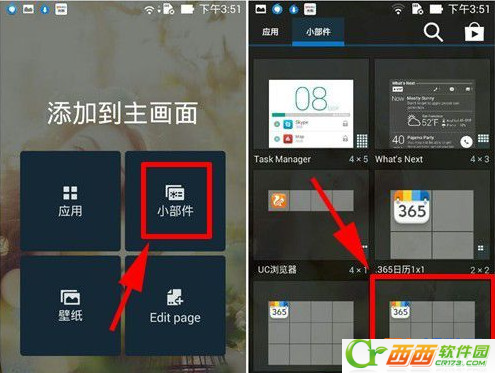 1)下载安装365日历应用,安装完成后在屏幕的空白处长按,出现“添加到主画面”页面,选择“小部件”,然后找到“日历4*3”的插件。