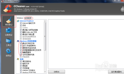 在打开了的CCleaner中,选择“清洁器”,接着,对需要进行清理的windows和应用程序进行选择,一般已经默认了很多需要清理的文件。