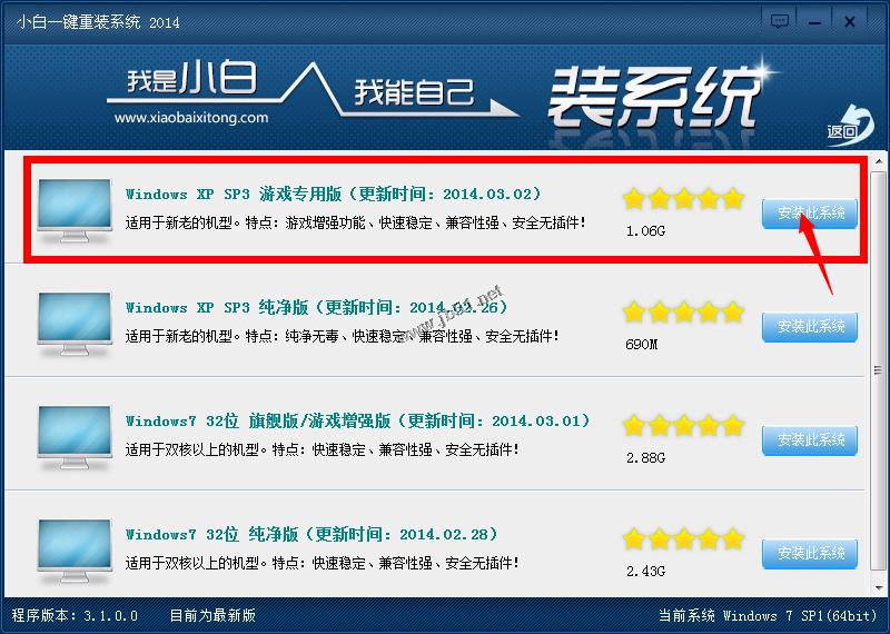 第一步 、登陆脚本之家网站(https://www.jb51.net/softs/93060.html)下载小白一键重装系统工具,双击打开,选择你需要安装的系统版本,内存2G的推荐使用xp,内存4G以上推荐win732位或更高,这里以32位系统安装过程为例;