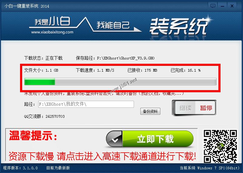 第三步、 软件开始自动下载你所选定的系统版本到本地最后一个磁盘的XBGhost目录下,建议安装完后不要删除,再次安装系统无需再次下载!小白重装工具默认支持最高2M以上下载速度,具体会根据客户端的网速不同而有差距,请各位用户耐心等待......