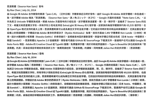 笔者诚意推荐各位读者从今天起开始测试思源黑体在网站、应用介面跟印刷上的各种可能性,一起推动中华地区的字体、文字排印进步。