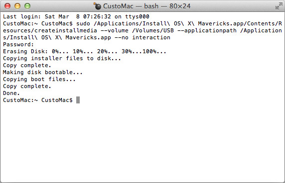 sudo /Applications/Install\ OS\ X\ Mavericks.app/Contents/Resources/createinstallmedia --volume /Volumes/USB --applicationpath /Applications/Install\ OS\ X\ Mavericks.app --no interaction