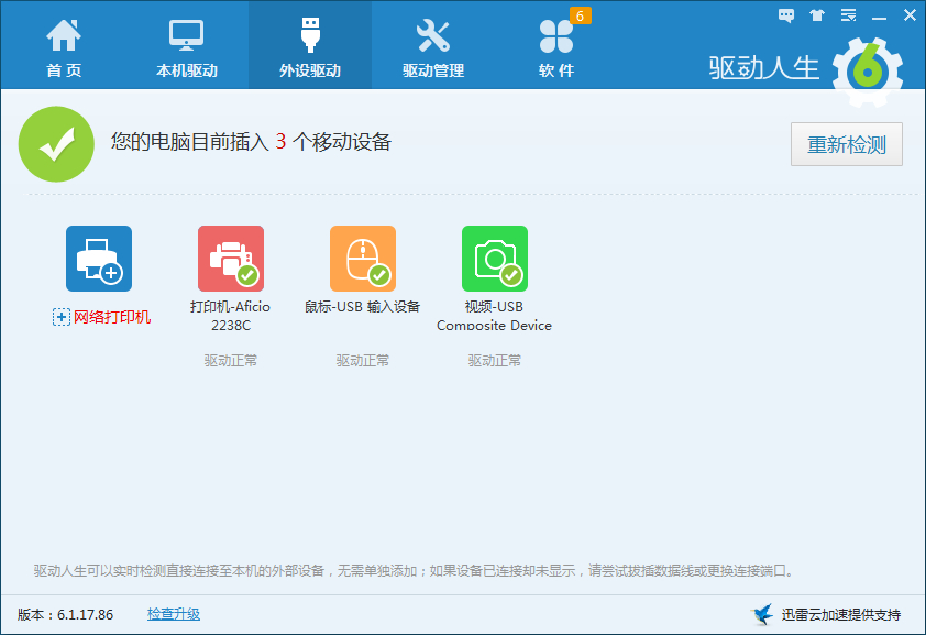 笔记本电脑需要安装的驱动程序不仅仅是上面这些基本驱动,还有很多笔记本专用的特别驱动。电源管理、触摸板、红外线、蓝牙、指纹识别等各种外设驱动,打开驱动人生的外设驱动,一键检测下,看您的电脑还有哪些外设驱动需要下载安装。