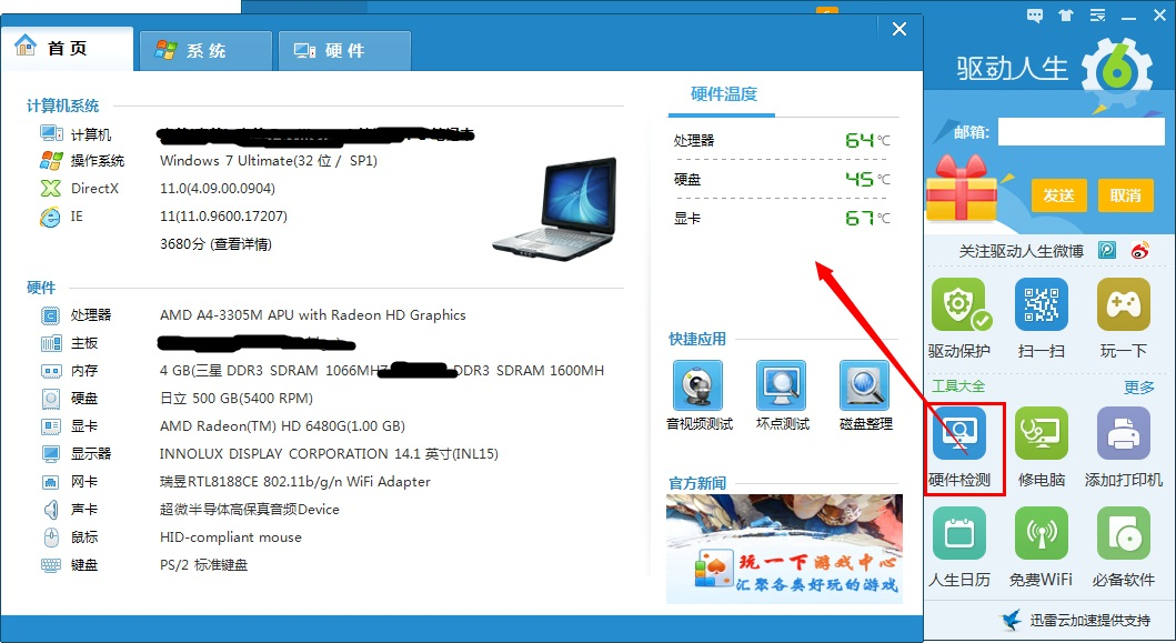 升级更新硬件驱动程序,可以使整机的性能提升不少。升级驱动时注意先弄清楚您电脑各个配件的具体品牌、型号。进入驱动人生硬件模块,系统信息,电脑信息一目了然。还可以通过硬件检测功能随时关注了解您电脑的使用情况。
