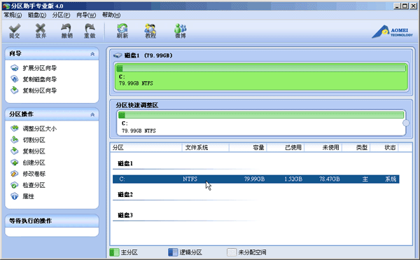 磁盘情况如图1所示,从图上可以看到磁盘1上只有一个分区C,约80GB,没有更多的分区。下面就在C盘的基础上快速的创建三个新的分区为例:
