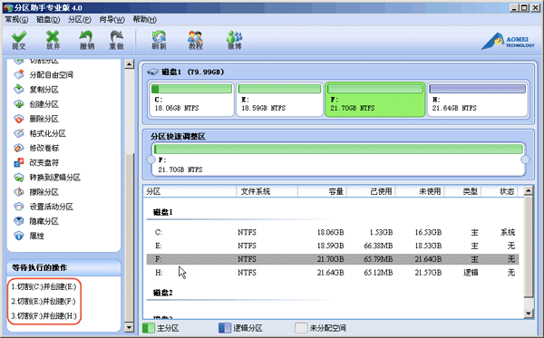 4、如图4红色框内,三次连续切割以后磁盘1上已经建立了E、F、H三个新的分区:
