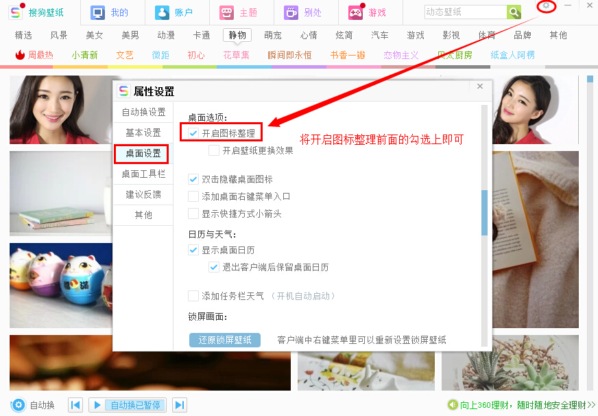 打开搜狗壁纸,找到设置--桌面设置,将桌面选项中的开启图标整理前面的勾选上即可。