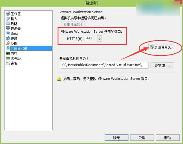 2、找到左侧功能列表中的“共享虚拟机”,选择后,在右侧界面中点击“更改设置”;