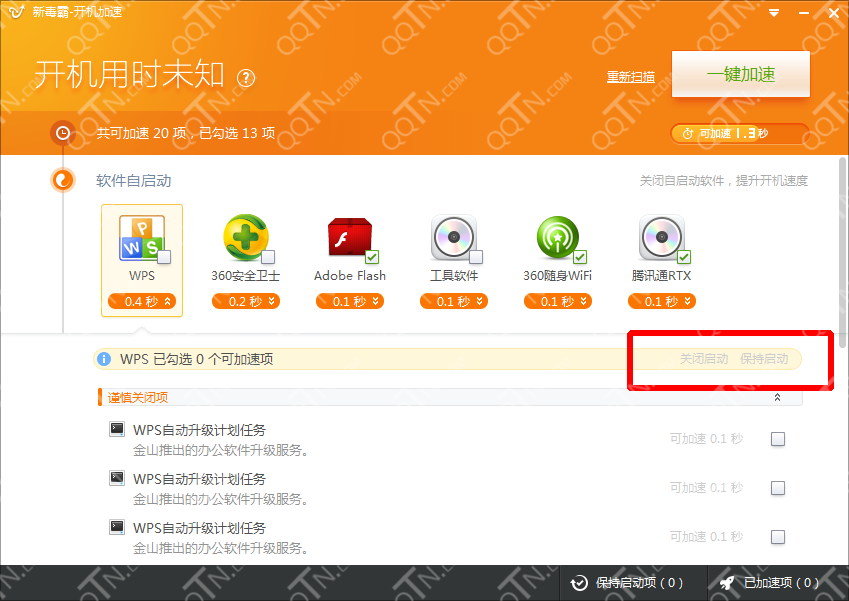 4、同时可以点击一键加速,加速之后,会自动关闭一些无用的启动项