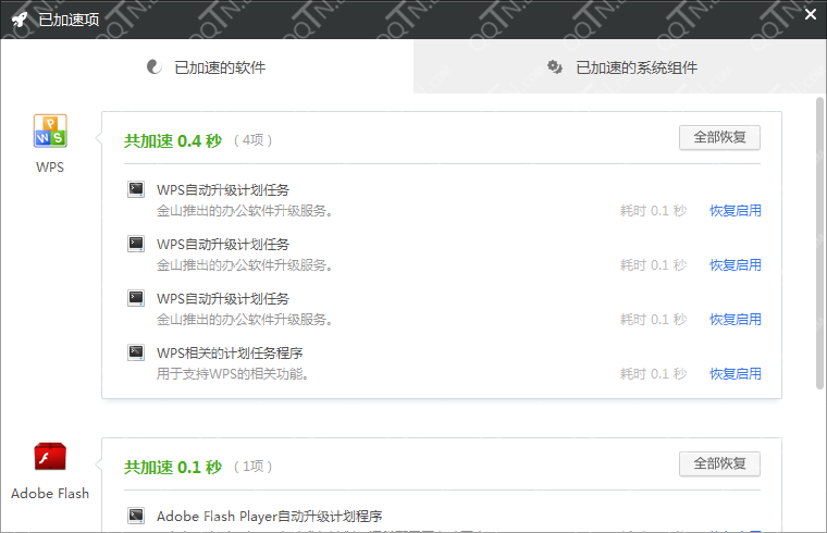 5、同时可以在下载进入已加速项管理,已经加速的软件和已经加速的系统组件,可以在这恢复启动
